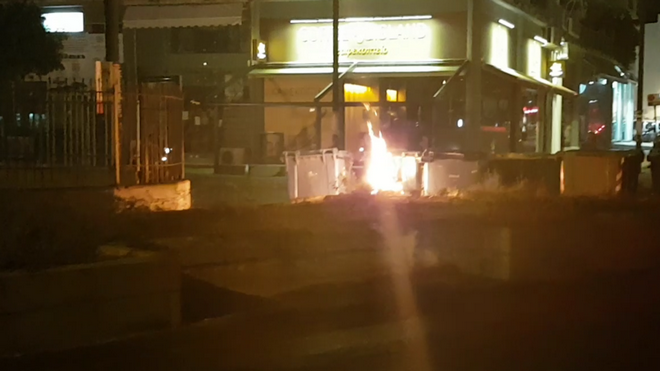 Κι ενώ η πορεία έφτασε στο Καστράκι λίγο μετά τις οκτώ το απόγευμα, όπου λαμβάνουν χώρα οι συναυλίες, η ίδια ομάδα 50 περίπου ατόμων πέταξε δύο – τρεις μολότοφ και έβαλε φωτιά σε κάδους στη συμβολή των οδών Εθνικής Αντιστάσεως και Αγίου Δημητρίου στη Δραπετσώνα.