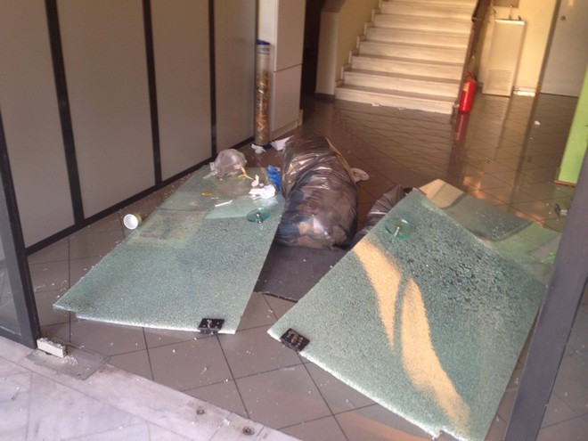 Αποχωρώντας από το σημείο που έλαβε χώρα το επεισόδιο οι νεαροί που πέταξαν τις μολότοφ, έσπασαν την πόρτα του ληξιαρχείου Κερατσινίου.