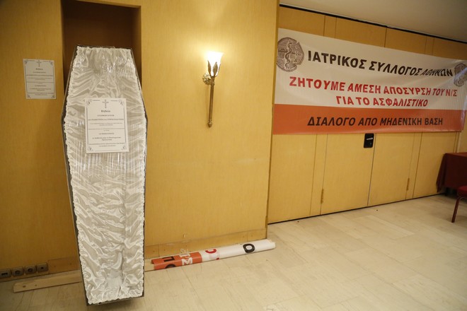 «Κηδεία των Ελλήνων γιατρών και επιστημόνων», αναγραφόταν στο φέρετρο που είχε τοποθετηθεί μέσα στην αίθουσα που διεξαγόταν η ημερίδα.