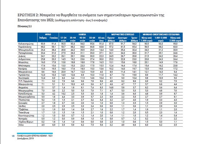 2. Κυρίαρχη προσωπικότητα της Ελληνικής Επανάστασης του 1821 αναδεικνύεται με μεγάλη διαφορά ο Θεόδωρος Κολοκοτρώνης (92,7%). Ακολουθεί ο Γεώργιος Καραϊσκάκης (63,1%). Κάτι που υπογραμμίσθηκε ως ιδιαιτέρως θετικό είναι το γεγονός ότι μια γυναίκα, η Μπουμπουλίνα, βρίσκεται στην πρώτη τριάδα, κάτι που δεν συναντά κανείς σε άλλες Επαναστάσεις. Ανάμεσα στους πλέον αναγνωρισμένους δέκα πρωταγωνιστές της Επανάστασης βρίσκεται και άλλη μια γυναίκα, η Μαντώ Μαυρογένους, στην 10η θέση.