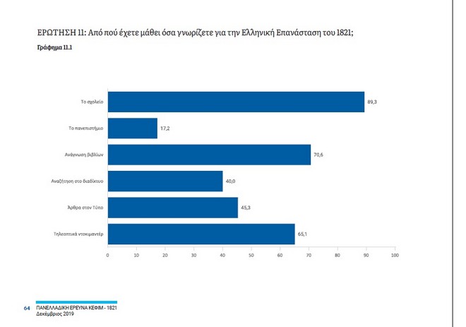 9. Το σχολείο αποτελεί την κυριότερη πηγή μάθησης για την Επανάσταση για τους περισσότερους Έλληνες. Επτά στους δέκα δεν είναι ικανοποιημένοι με τον τρόπο διδασκαλίας της ιστορίας της Επανάστασης στο σχολείο και 9 στους 10 ζητούν να δοθεί μεγαλύτερη βαρύτητα στη διδασκαλία της. «Καθώς όμως 2 στους 3 λένε πως κύρια πηγή γνώσης είναι το σχολείο, αποκτά μεγάλη σημασία το σχεδόν καθολικό αίτημα (88%) της ελληνικής κοινωνίας να δοθεί μεγαλύτερη βαρύτητα στην διδασκαλία της Επανάστασης του 1821 στα σχολεία», υπογράμμισε κατά την παρουσίαση η Σοφία Τσιλιγιάννη.