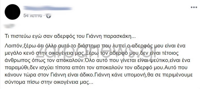 Όλο αυτό που γίνεται είναι ψεύτικο, είναι ένα παραμύθι, δεν ισχύει τίποτα απ’ότι τον αποκαλούν τον αδερφό μου. Αυτό που κάνουν τώρα στον Γιάννη είναι άδικο. Γιάννη κάνε υπομονή, θα σε περιμένουμε σύντομα πίσω στην οικογένεια μας…»