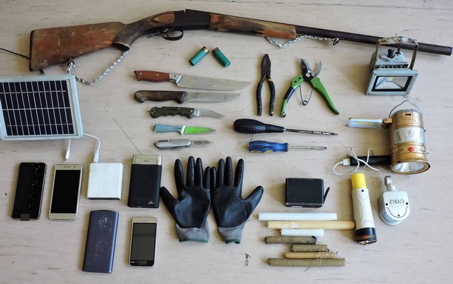 Συγκεκριμένα στην κατοχή του βρέθηκε και κατασχέθηκε τσαντάκι μέσης που περιείχε δύο κινητά τηλέφωνα και σε κοντινή απόσταση από το σημείο εντοπισμού του βρέθηκαν και κατασχέθηκαν επίσης, ένα κυνηγητικό μονόκαννο όπλο, οπλισμένο έτοιμο για χρήση, με φυσίγγιο στη θαλάμη, ένα ακόμα κυνηγητικό φυσίγγιο, δύο μαχαίρια με ξύλινη λαβή και δύο σουγιάδες μήκους λάμας από 15 έως 20 εκ., τέσσερις συσκευές αποθήκευσης ηλεκτρικής ενέργειας (PowerBank), δύο κατσαβίδια, φωτιστική λάμπα ελαίου, μικρός προβολέας και επαναφορτιζόμενος φακός χειρός, ηλιακό πάνελ παροχής ηλεκτρικής ενέργειας με καλώδια φόρτισης κινητών, τρεις φορτιστές κινητών τηλεφώνων, μικρό χρηματικό ποσό, σακίδιο πλάτης παραλλαγής και ένας υπνόσακος (Sleeping Bag), ένα ακόμη κινητό τηλέφωνο καθώς και ρουχισμός