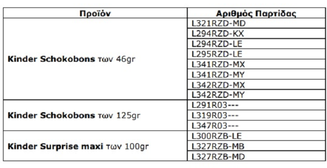 Ο ΕΦΕΤ ενημερώθηκε από το Σύστημα Έγκαιρης Προειδοποίησης για τα Τρόφιμα και τις Ζωοτροφές (RASFF), σχετικά με την προληπτική ανάκληση συγκεκριμένων παρτίδων των προϊόντων Kinder Schokobons των 46 gr & 125 gr και Kinder Surprise maxi των 100 gr, λόγω πιθανής παρουσίας σαλμονέλας.