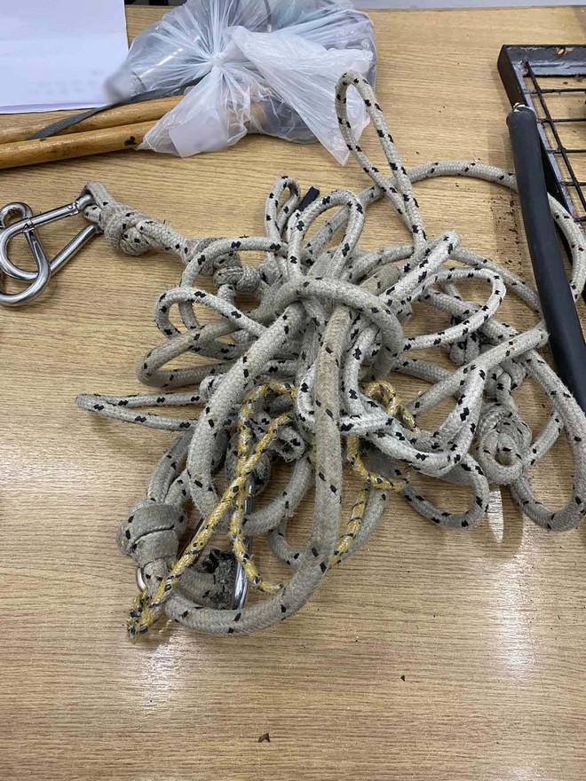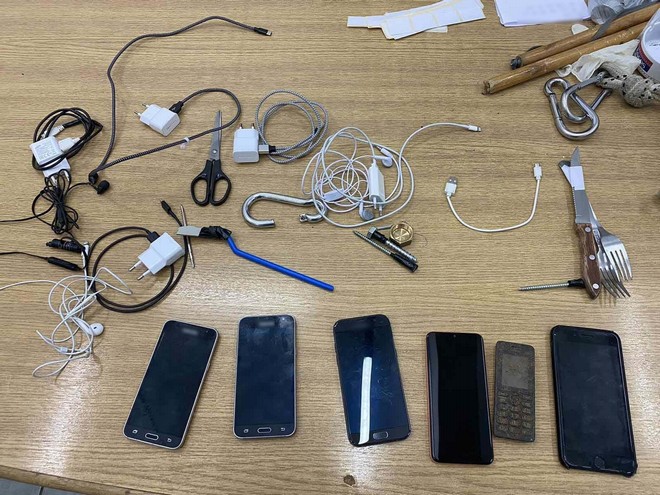 Επίσης βρέθηκαν 2 ορειβατικά σχοινιά με 4 και 2 γάντζους, αντίστοιχα, 7 ξύλινα κοντάρια και 3 κοντάρια σκούπας, 5 κουτάλια, 6 πιρούνια, μαχαίρι κουζίνας, ψαλίδι και ξυράφι, 2 μπουκάλια οινόπνευμα, 2 βελόνες και σύνεργα τατουάζ, 2 κατσαβίδια, ηλεκτρικό κολλητήρι, μέτρο, πένσα και 2 βίδες, σχάρα, σπάτουλα και λάστιχο, 2 σακουλάκια πιθανόν κάνναβη, βάρους 0,4 gr, 2 δοχεία με σκόνες άγνωστης προέλευσης, 8 κινητά τηλέφωνα, 12 φορτιστές και μπαταρία κινητού, 7 handsfree και bluetooth, 7 καλώδια και 2 καλώδια USB.