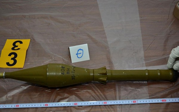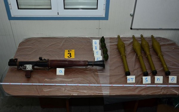 Πρόκειται, όπως είχαμε γράψει και την Παρασκευή, για τέσσερις ρουκέτες τύπου RPG, τέσσερις προωθητικούς μηχανισμούς RPG, εκτοξευτήρα RPG, τέσσερις αμυντικές χειροβομβίδες F1, τέσσερις πυροδοτικούς μηχανισμούς των χειροβομβίδων, τρία καλάσνικοφ, επτά γεμιστήρες καλάσνικοφ, δύο κοντάκια καλάσνικοφ, κουτιά με σφαίρες καλάσνικοφ, γάντια και κουκούλες.