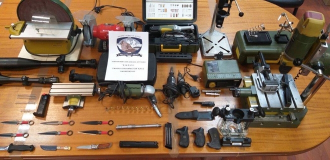 Σε επακόλουθες έρευνες στην μοτοσυκλέτα του, στις δύο οικίες του και σε ειδικό χώρο στάθμευσης – αποθήκης, βρέθηκαν και κατασχέθηκαν περίστροφο κρότου, πλήθος φυσιγγίων πυροβόλου όπλου, πλήθος τμημάτων και εξαρτημάτων όπλων καθώς και παρελκόμενα είδη αυτών, διόπτρα, σιγαστήρας, μαχαίρι και ειδικός εξοπλισμός για επεξεργασία μετάλλων.