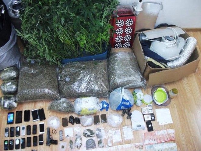 Στην κατοχή των συλληφθέντων βρέθηκαν και κατασχέθηκαν περίπου 20 κιλά χασίς, 400 γραμμ. κατεργασμένης κάνναβης, 10 δενδρύλλια υδροπονικής καλλιέργειας (σκανκ), ποσότητα χαπιών μεθαμφεταμίνης MDMA, 200 γραμμ. κοκαΐνης, ζυγαριές ακριβείας και όπλα.