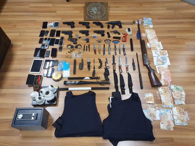 Σε έρευνες που πραγματοποιήθηκαν σε οικίες και οχήματα των συλληφθέντων, καθώς και στην κατοχή τους, μεταξύ άλλων, βρέθηκαν και κατασχέθηκαν υποπολυβόλο με 2 γεμιστήρες, 5 πιστόλια, εκ των οποίων το ένα με αποξασμένο σειριακό αριθμό, τυφέκιο και 2 περίστροφα, αεροβόλο με γεμιστήρα, γεμιστήρα πυροβόλου όπλου με 7 φυσίγγια, πιστόλι τύπου airsoft, 4 σιδερογροθιές, το χρηματικό ποσό των 19.910 ευρώ, 2 μεταλλικές πτυσσόμενες ράβδοι, 3 μοτοσικλέτες και 3 αυτοκίνητα, πλήθος φυσιγγίων διαφόρων διαμετρημάτων, διάφορα μαχαίρια και ξιφίδια, 7 κροτίδες, αναβολικά σκευάσματα, μεταλλικές χειροπέδες, ρόπαλο, ξύλινο κλομπ και πλαστική ράβδος.