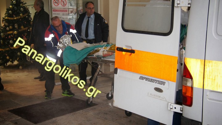 Τόσο ο δράστης όσο και το θύμα μεταφέρθηκαν στο νοσοκομείο Ναυπλίου όπου διαπιστώθηκε ότι η γυναίκα φέρει τραύμα από πυροβόλο όπλο στο κεφάλι και αφού της παρασχέθηκαν οι πρώτες βοήθειες αναχώρησε αμέσως για νοσοκομείο των Αθηνών όπου η κατάστασή της κρίνεται σοβαρή.