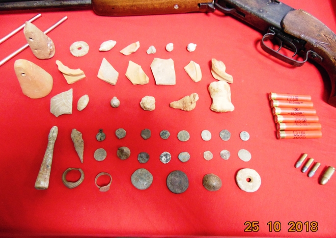 Ειδικότερα, στο πλαίσιο της παραπάνω επιχείρησης, βρέθηκαν στην οικία του 68χρονου και κατασχέθηκαν 14 χάλκινα και ασημένια νομίσματα που χρονολογούνται στους ρωμαϊκούς χρόνους, τμήμα από σιδερένιο μαχαιρίδιο, 4 χάλκινα αντικείμενα – εξαρτήματα ζώνης, 8 μεταλλικά σφαιρικά αντικείμενα, 18 τεμάχια – τμήματα πήλινων αγγείων – προτομών – αντικειμένων, φορητός πομποδέκτης, λειόκαννη καραμπίνα, 10 φυσίγγια, δύο ράβδοι ανίχνευσης, αρχαιολογικός και τουριστικός οδηγός Νομού της Θεσσαλίας έτους 1976, στοιχεία για δύο υπηρεσίες χαρτογραφήσεων/τοπογραφήσεων, δύο εκτυπωμένοι χάρτες και εγχειρίδιο που αφορά σε αρχαία Ελληνικά νομίσματα.