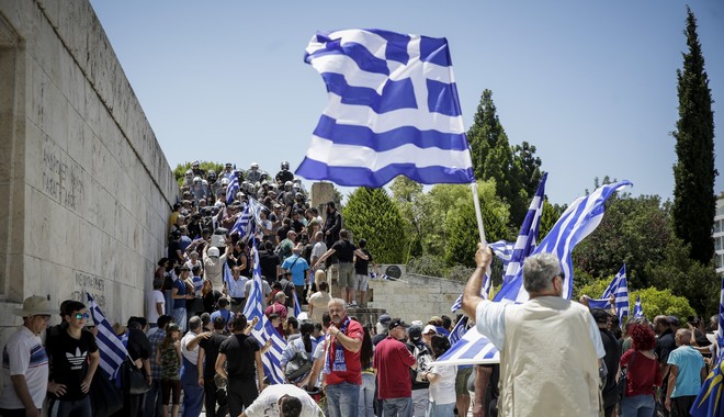 Αυτή τη στιγμή επικρατεί ηρεμία με τους διαδηλωτές να παραμένουν στα σκαλιά που οδηγούν στο Κοινοβούλιο, ενώ κάποιοι έχουν απλώσει πάνω στο μνημείο του Αγνώστου Στρατιώτη μια ελληνική σημαία και μια σημαία με τον Ήλιο της Βεργίνας.