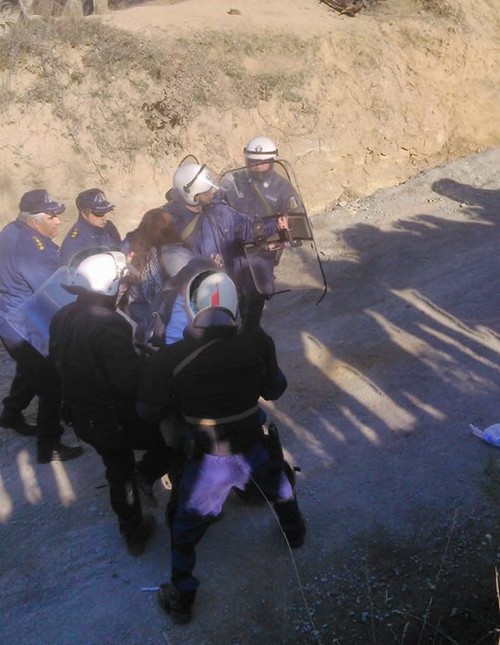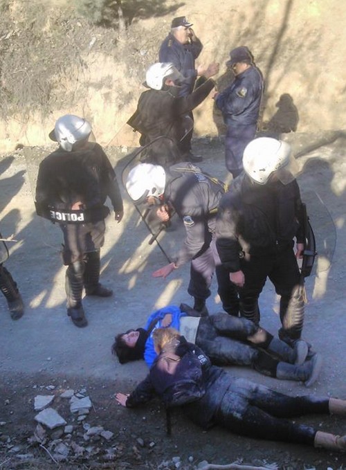 Οι γυναίκες που συμμετείχαν στη συγκέντρωση σχημάτισαν αλυσίδες. Τότε, τα ΜΑΤ επιτέθηκαν στους διαδηλωτές με χημικά, σύμφωνα με πληροφορίες χρησιμοποιήθηκαν και κλομπ. Αυτό είχε ως αποτέλεσμα τρεις άνθρωποι να τραυματιστούν και να μεταφερθούν στο Κέντρο Υγείας.