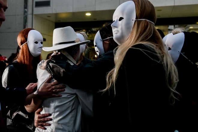 Αργά το απόγευμα, η Ιωάννα Παλιοσπύρου βγήκε από το δικαστικό μέγαρο. Τριγύρω της βρίσκονταν οι εννέα φίλες της που καθ’όλη τη διάρκεια της συνεδρίασης βρίσκονταν στο πλευρό της. Φόρεσαν τις λευκές τους μάσκες και κάθισαν στο πλευρό της, δηλώνοντας με αυτό τον τρόπο πως κάθε γυναίκα θα μπορούσε να είναι στη θέση της Ιωάννας. Όταν πλέον έσβησαν τα φώτα των καμερών, η Ιωάννα πλησίασε τους δημοσιογράφους δωρίζοντάς τους μικρά βραχιολάκια, με τη φράση “είμαι δυνατή”.