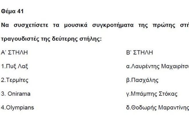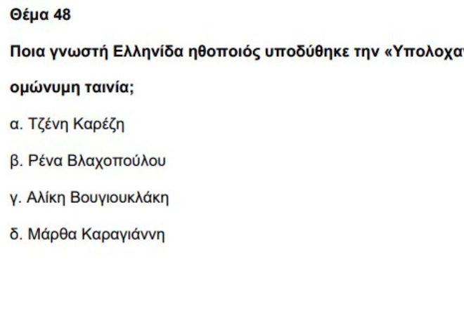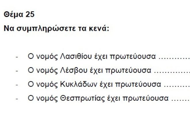 Στην κατηγορία “Γεωγραφία” ζητείται από τους υποψήφιους να γράψουν τους νομούς της χώρας, οι οποίοι έχουν αντικατασταθεί από το 2011 από τις περιφερειακές ενότητες, μπερδεύοντας ουσιαστικά κάποιον ξένο που προσπάθησε να μάθει με ορθό τρόπο την ύλη.