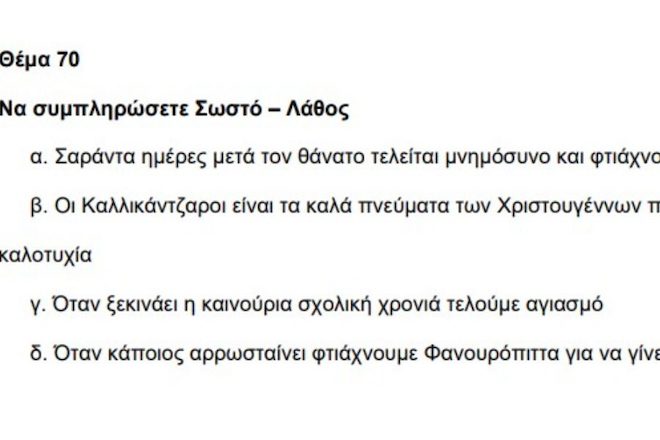 Ερωτήσεις για καλικάτζαρους, φανουρόπιτες, στρατιωτικά πηλίκια και νομούς (που αντικαταστήθηκαν από το 2011 από τις περιφερειακές ενότητες) συμπεριλαμβάνονται στις ερωτήσεις που καλούνται να απαντήσουν οι αιτούντες ελληνική ιθαγένεια.