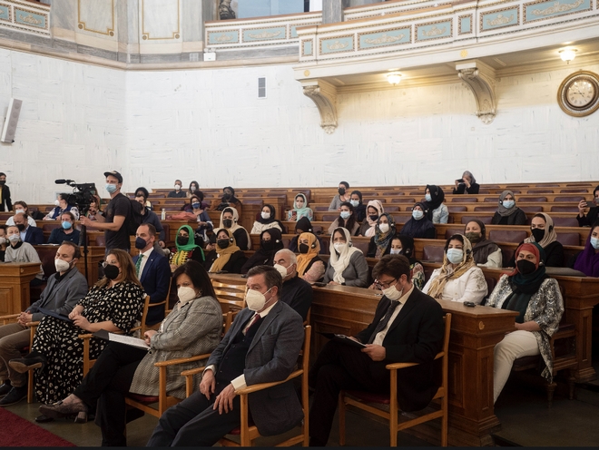 Στην Παλιά Βουλή, εναρκτήριους χαιρετισμούς έκαναν οι προσκεκλημένοι ομιλητές, η Μαρία Συρεγγέλα, Υφυπουργός Εργασίας και Κοινωνικών Υποθέσεων, Αρμόδια για θέματα Δημογραφικής Πολιτικής και Οικογένειας, η Stella Ronner-Grubaki, Πρέσβης για το Φύλο και τη Διαφορετικότητα της Ευρωπαϊκής Επιτροπής Εξωτερικής Δράσης (EEAS), η Hanna Neumann, Μέλος του Ευρωκοινοβουλίου (Κόμμα Πρασίνων/EFA), ο Μάνος Μοσχόπουλος από το Open Society Foundations, και η Ναντίνα Χριστοπούλου από το Δίκτυο Μέλισσα. Παρόντες στην εκδήλωση ήταν η Χαρά Καφαντάρη και ο Γιώργος Ψυχογιός, μέλη του κοινοβουλίου (ΣΥΡΙΖΑ), ο βουλευτής Γιώργος Καμίνης, ο Βασίλης Χρονόπουλος (Κίνημα Αλλαγής), και ο Νίκος Χρυσόγελος (Πράσινοι – Αλληλεγγύη) καθώς και αντιπροσωποι Πρεσβειών, εκπρόσωποι της κοινωνίας των πολιτών και των μεταναστευτικών και προσφυγικών κοινοτήτων. Ανάμεσά τους και οι γυναίκες επικεφαλής του συντονιστικού οργάνου της Ουκρανικής κοινότητας, οι οποίες μοιράστηκαν ενός λεπτού σιγή για την Ουκρανία και το Αφγανιστάν.