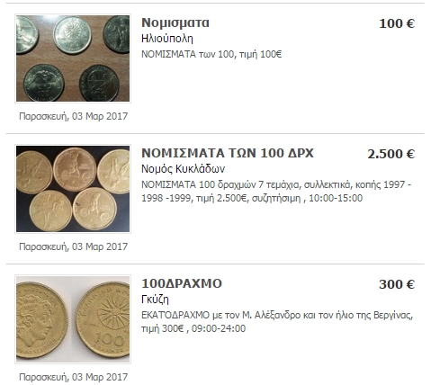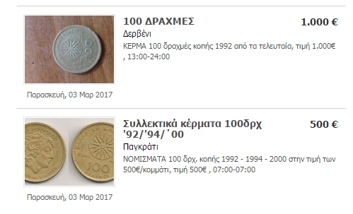 Πολλοί πολίτες που διέθεταν κέρματα των 100 δραχμών άρχισαν να τα “βγάζουν” στο διαδίκτυο για να επιχειρήσουν την ανταλλαγή τους έναντι μεγάλων ποσών σε ευρώ. Την ίδια ώρα όμως στο ebay τα κέρματα των 100 δραχμών πωλούνται έναντι ενός ευρώ μόλις.