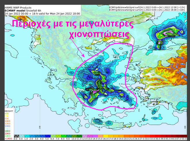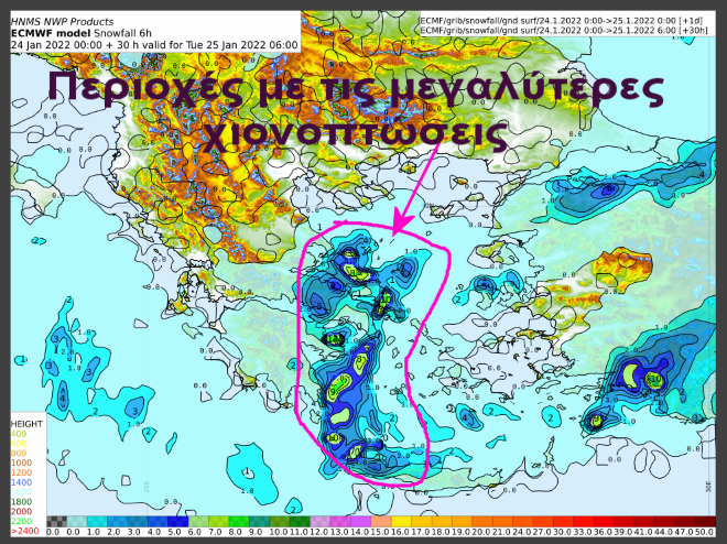 Στον χάρτη που ακολουθεί παρουσιάζονται οι περιοχές που θα δεχτούν τις εντονότερες χιονοπτώσεις, με τα μεγαλύτερα ποσά χιονιού μέχρι και τις 8 τοπική ώρα Ελλάδος να σημειώνονται στην Εύβοια την Ανατολική Στερεά , την Ανατολική Πελοπόννησο τις κεντρικές και τις βόρειες Κυκλάδες .
