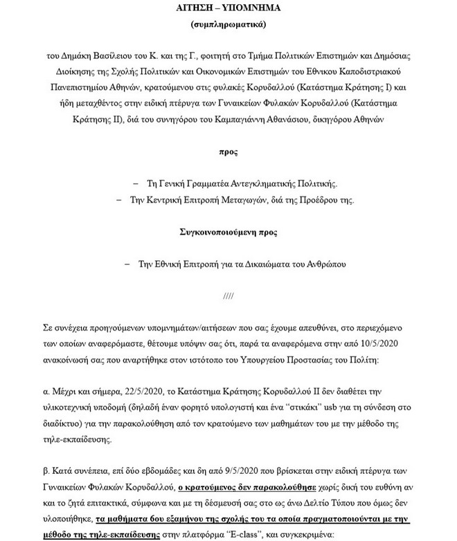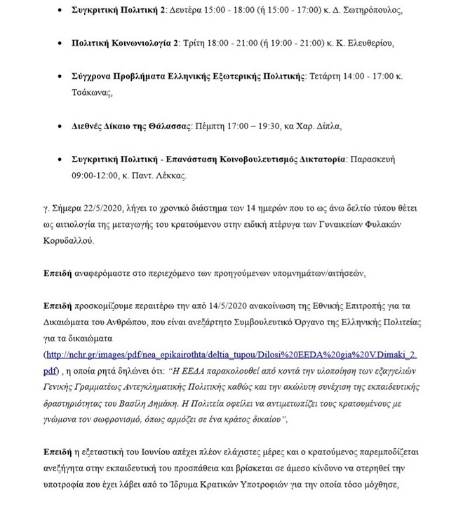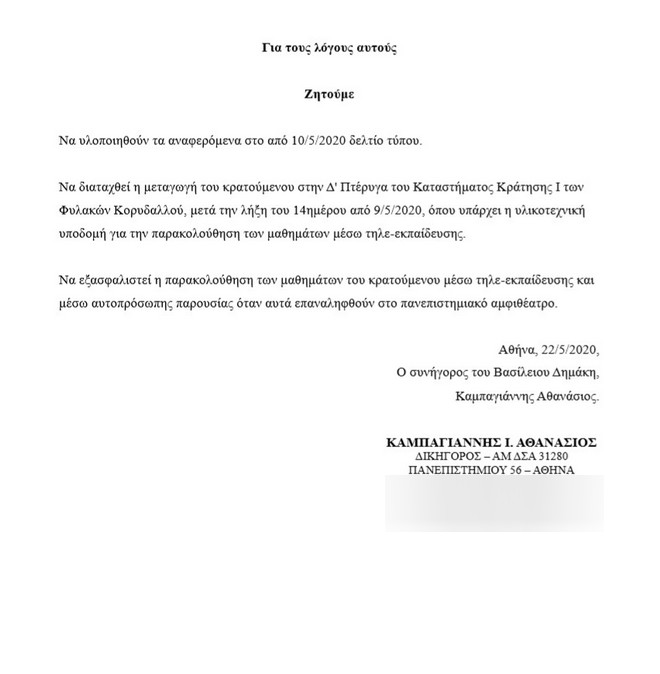 Μιλώντας στο News 24/7, ο συνήγορος του, Θανάσης Καμπαγιάννης αναφέρει: «Την Παρασκευή, 22 Μαΐου, επιδώσαμε υπόμνημα στην Γενική Γραμματεία Αντεγκληματικής Πολιτικής και την Κεντρική Επιτροπή Μεταγωγών, αναφέροντας πως εδώ και δύο εβδομάδες δεν έχει χορηγηθεί ένα laptop και ένα στικάκι usb με ίντερνετ για να μπορεί ο Βασίλης Δημάκης να παρακολουθεί τα μαθήματά του. Ήταν ακόμη ένα έγγραφο στο οποίο δεν λάβαμε καμία απάντηση»