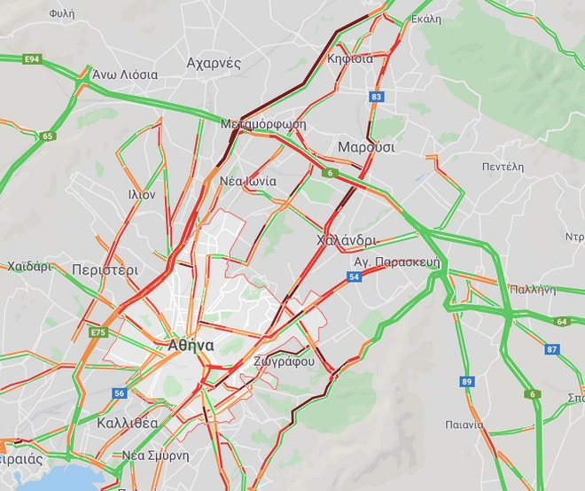 Συγκεκριμένα, στο “κόκκινο” είναι η κίνηση αυτή την ώρα στη Λεωφόρο Κηφισίας και συγκεκριμένα στο ρεύμα ανόδου από το ύψος της Ζωγράφου μέχρι και το Μαρούσι, ενώ στο ρεύμα καθόδου κίνηση παρατηρείται από το ύψος του Μαρουσίου μέχρι και το Χαλάνδρι.