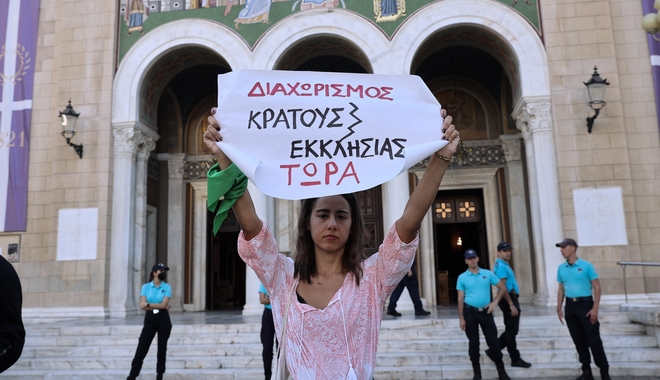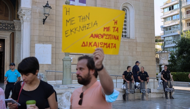Συγκέντρωση διαμαρτυρίας πραγματοποιήθηκε σήμερα Πέμπτη (08/09) έξω από την Μητρόπολη Αθηνών με αφορμή την απόφαση της Ιεράς Συνόδου να αναγνωσθεί σε όλες τις εκκλησίες κείμενο κατά των αμβλώσεων.