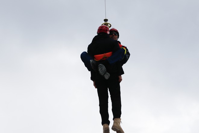 Οι διασώστες κατέβηκαν δεμένοι με ειδικό εξοπλισμό από το ελικόπτερο, περισυνέλλεξαν τους δύο "εγκλωβισμένους" κατοίκους και στη συνέχεια επέστρεψαν στο ιπτάμενο όχημα.