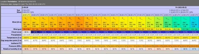 Μέσα στον Κορινθιακό και για το στίγμα που έχουμε επιλέξει οι άνεμοι φτάνουν τα 6 με 7 μποφόρ μέχρι τα ξημερώματα της Παρασκευής , ενώ οι ριπές τους είναι κατά 2 μποφόρ παραπάνω όπως σας ανέφερα στο προηγούμενο video