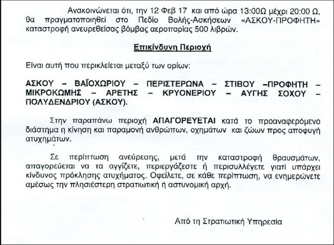 Οι περιοχές που θα εκκενωθούν γύρω από το σημείο που θα εξουδετερωθεί η βόμβα και θα απαγορεύεται η παραμονή και η κίνηση ανθρώπων, οχημάτων και ζώων προς αποφυγή ατυχήματος, είναι: Ασκού – Βαϊοχωρίου – Περιστερώνα – Στίβου – Προφήτη – Μικροκώμης – Αρετής – Κρυονερίου – Αυγής Σοχού – Πολυδενδρίου.