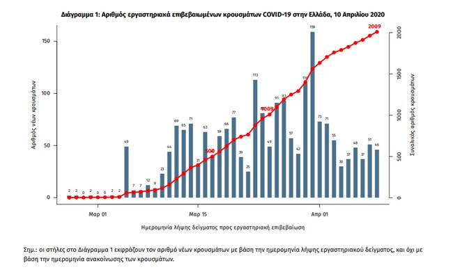 Σύμφωνα με την έκθεση τα νέα επιβεβαιωμένα εργαστηριακά κρούσματα της νόσου είναι 54 και ο συνολικός αριθμός των κρουσμάτων ανέρχεται σε 2.009 (ημερήσια μεταβολή +2.8%), εκ των οποίων 57.1% άνδρες. Να επισημάνουμε χθες ότι ο κ. Σωτήρης Τσιόδρας κατά την ενημέρωση ανέφερε δύο επιπλέον με τα συνολικά να ανέρχονται στα 2011, 124 εκ των οποίων ε΄χουν εντοπίστει στο πλοίο Ελ. Βενιζέλος.