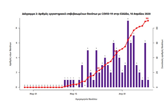 Οι νέοι θάνατοι ασθενών με COVID-19 είναι 4, ενώ από την έναρξη της επιδημίας έχουν καταγραφεί συνολικά 90 θάνατοι. Η μέση ηλικία των ασθενών που απεβίωσαν είναι 73 έτη. Ο αριθμός των ασθενών που νοσηλεύονται διασωληνωμένοι είναι 77 (81.8% άνδρες). Η ημερήσια κατανομή των επιβεβαιωμένων κρουσμάτων είναι η ακόλουθη (η γραμμή παριστάνει την συνολική, αθροιστική κατανομή των κρουσμάτων).
