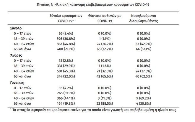 Η μέση ηλικία των κρουσμάτων είναι 49 έτη (εύρος 0 έως 101 ετών), ενώ η μέση ηλικία των θανάτων είναι 73 έτη (εύρος 39 έως 95 ετών). Η ηλικιακή κατανομή των (α) συνολικών κρουσμάτων, (β) των περιστατικών που κατέληξαν σε θάνατο και (γ) των ασθενών που νοσηλεύονται διασωληνωμένοι, είναι η ακόλουθη: