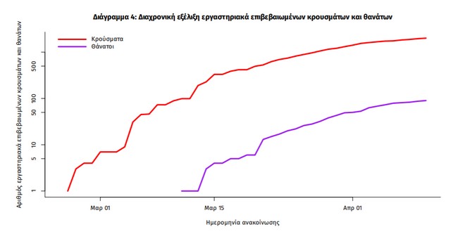 Η διαχρονική εξέλιξη των συνολικών κρουσμάτων και συνολικού αριθμού των θανάτων ασθενών COVID-19 παρουσιάζεται στο ακόλουθο διάγραμμα (σε λογαριθμική κλίμακα).