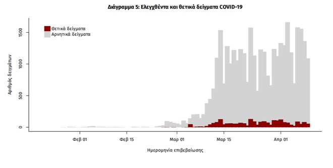 Δείγματα που έχουν ελεγχθεί στα συνεργαζόμενα με τον ΕΟΔΥ εργαστήρια: Από την 1η Ιανουαρίου 2020 μέχρι σήμερα, στα εργαστήρια που διενεργούν ελέγχους για τον νέο κορωνοϊό (SARS-CoV-2) και που δηλώνουν συστηματικά στον ΕΟΔΥ το σύνολο των δειγμάτων που ελέγχουν (θετικά και αρνητικά), έχουν συνολικά ελεγχθεί 35432 κλινικά δείγματα, εκ των οποίων τα 2308 (6.5%) ήταν θετικά στον κορονοϊό.