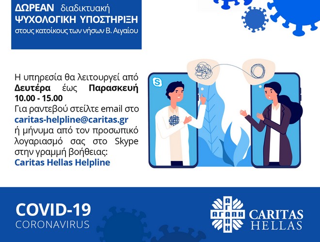 Καθώς η ψυχολογική υποστήριξη είναι πιο επιτακτική από ποτέ, η Κάριτας Ελλάς για την αντιμετώπιση των ψυχολογικών συνεπειών της πανδημίας προσφέρει δωρεάν υπηρεσίες στήριξης μέσω τηλεδιάσκεψης στον πληθυσμό που διαμένει στα νησιά του Β.Αιγαίου για τους επόμενους 2 μήνες.