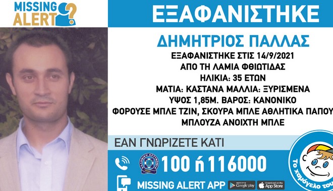 Συναγερμός έχει σημάνει στις Αρχές για την εξαφάνιση του 35χρονου Δημήτρη Πάλλα, που εξαφανίστηκε από το σπίτι όπου διέμενε στη Λαμία στις 14 Σεπτεμβρίου.