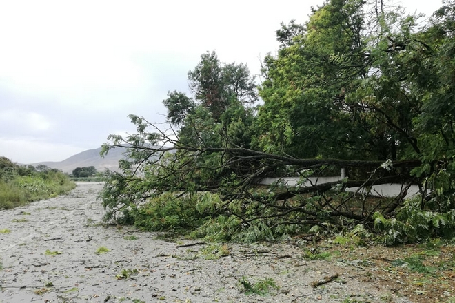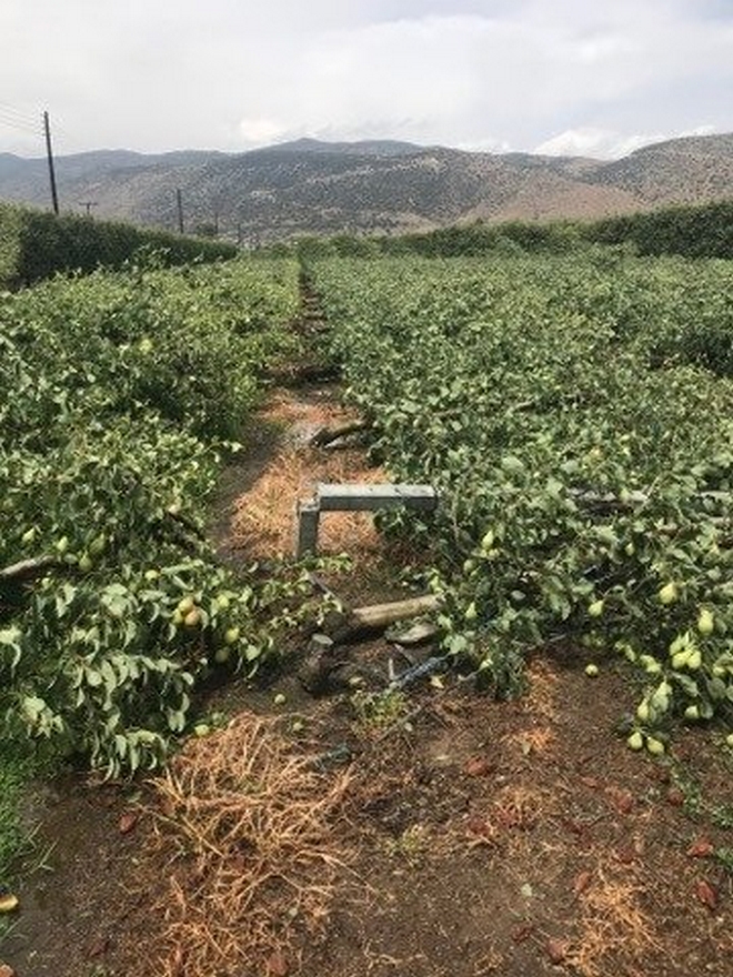Από το χαλάζι έχουν ήδη προκληθεί ζημιές στις καλλιέργειες, ενώ ο δυνατός άνεμος προκάλεσε πτώσεις δέντρων στην περιοχή.
