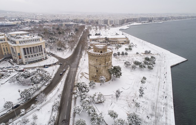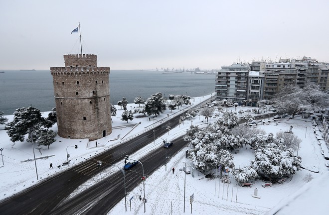 Η σφοδρή χιονόπτωση και το πολικό ψύχος, λόγω της κακοκαιρίας “Σοφία”, “έντυσε” τη Θεσσαλονίκη στα λευκά το πρωί του Σαββάτου.