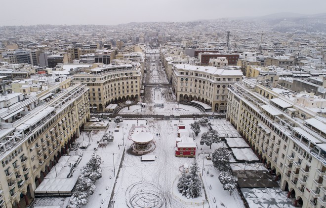 Το κέντρο της πόλης καλύφθηκε από χιόνι. Τα δρομολόγια του ΟΑΣΘ σταμάτησαν, ενώ κάποια μαγαζιά κατέβασαν ρολά.