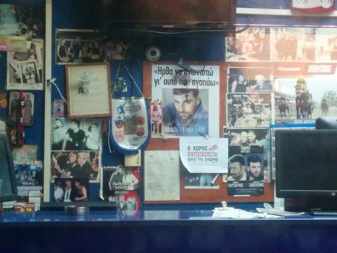 Εικόνα μέσα από το κατάστημα της οικογένειας Παντελίδη. Σε περίοπτη θέση βρίσκεται φωτογραφία του καλλιτέχνη με τη φράση “Ήρθα να αγωνιστώ γι’ αυτό που αγαπάω”!