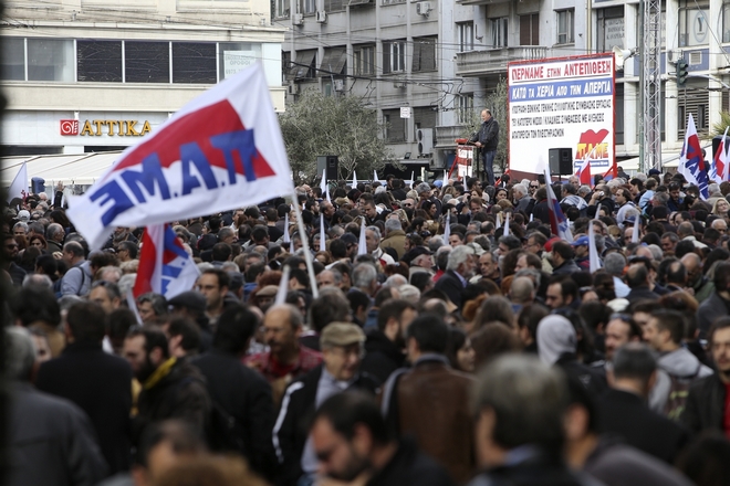 Τα συνδικάτα πραγματοποίησαν κάλεσμα προκειμένου «να σταλεί ηχηρό μήνυμα σε κυβέρνηση, δανειστές και ΣΕΒ ότι διεκδικούμε: