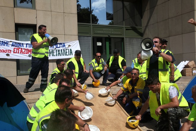 Περισσότεροι από 40 μεταλλωρύχοι από τα μεταλλεία της βορειοανατολικής Χαλκιδικής έχουν κατασκηνώσει από το πρωί έξω από το υπουργείο Παραγωγικής Ανασυγκρότησης, Περιβάλλοντος και Ενέργειας, στη λεωφόρο Μεσογείων, απαιτώντας να εφαρμοστούν οι δικαστικές αποφάσεις που προβλέπουν την επαναλειτουργία των έργων στην Ολυμπιάδα, το Μαντέμ-Λάκκο, και τις Σκουριές.