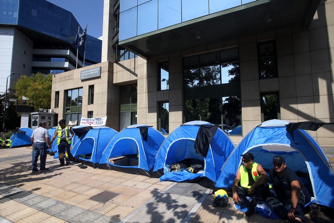 Μεταλλωρύχοι από τις Σκουριές κατασκήνωσαν έξω από το υπουργείο ΠΑΠΕΝ