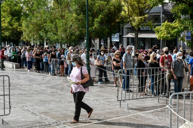 Πλήθος κόσμου περίμενε υπομονετικά στη μεγάλη ουρά που είχε σχηματιστεί από το πρωί στο πεζοδρόμιο επί της οδού Μητροπόλεως για το «τελευταίο αντίο» στον κορυφαίο μουσικοσυνθέτη και πολιτικό, Μίκη Θεοδωράκη.