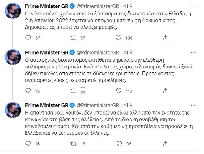 «Πενήντα πέντε χρόνια από το ξέσπασμα της δικτατορίας στην Ελλάδα, η 21η Απριλίου 2022 έρχεται να υπογραμμίσει πως η δοκιμασία της Δημοκρατίας μπορεί να αλλάζει μορφές», έγραψε σε ανάρτησή του στο διαδίκτυο ο Κυριάκος Μητσοτάκης.