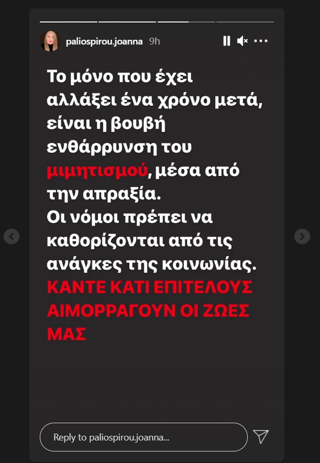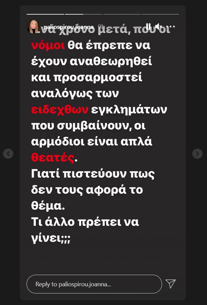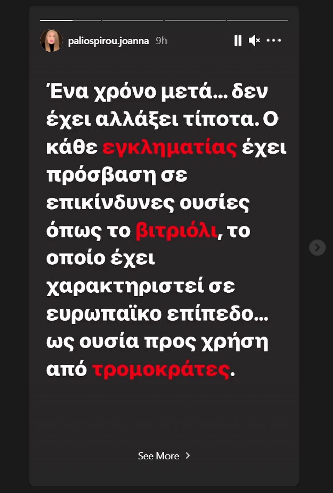 Η Ιωάννα Παλιοσπύρου, η οποία ανεβαίνει τον δικό της Γολγοθά, προχώρησε σε μια σειρά από αναρτήσεις στον προσωπικό της λογαριασμό στο Instagram σχετικά με το περιστατικό. Η 33χρονη εξέφρασε την οργή της για την απουσία νομοθετικού πλαισίου και το γεγονός ότι ο καθένας μπορεί να προμηθευτεί πολύ εύκολα καυστικό έργο μέσω του διαδικτύου.