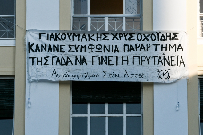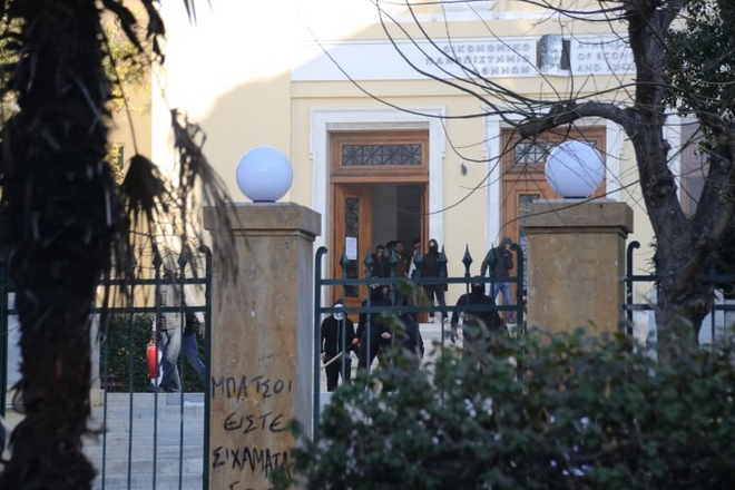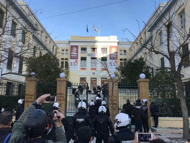 Ομάδα ατόμων έστησε οδοφράγματα έξω από το Πανεπιστήμιο, ενώ στη συνέχεια σημειώθηκε ένταση αφού πέταξαν αντικείμενα προς άνδρες των ΜΑΤ. Οι τελευταίοι τους απώθησαν, με αποτέλεσμα οι διαδηλωτές να αποχωρήσουν εντός της ΑΣΟΕΕ.