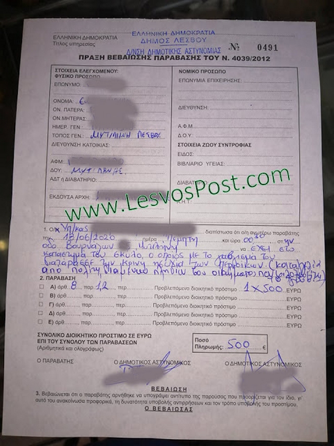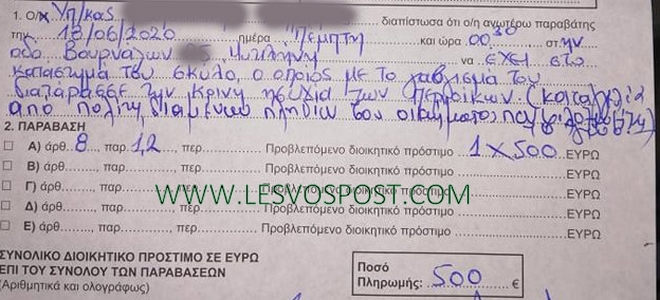 Πρόστιμο ύψους 500 ευρώ καλείται να πληρώσει ένας κάτοικος της Μυτιλήνης, επειδή ο σκύλος του γαβιζε. Όπως κατήγγειλε ο ίδιος στο lesvospost.gr η αστυνομια του έκοψε πρόστιμο μετά απο καταγγελία γείτονά του.