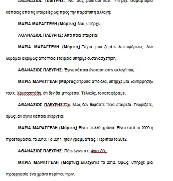Θυμάμαι να λέω: Μα, κυρία Τουλουπάκη, εγώ προσπαθώ να καταθέσω εδώ και καιρό.Δεν χρειάζομαι προστασία. Τι προστασία; Φωνάξτε με να καταθέσω. Μου λέει: «Δεν εννοώ αυτό». Κατάλαβα στην κουβέντα -οι δικηγόροιμου είχαν μείνει άφωνοι, γιατί αυτοί καταλάβαιναν περισσότερα από μένα- ότι δεν εννοούσε να καταθέσω αυτά που θα κατέθετα σαν αλήθεια. Έπρεπε να καταθέσω κάτι άλλο.