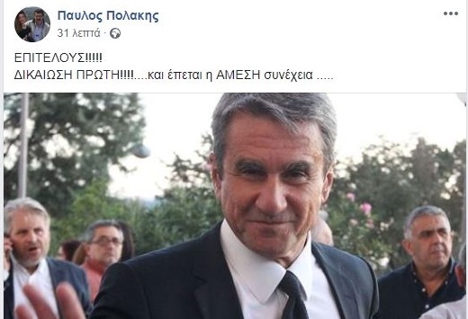 Από την πλευρά του ο Παύλος Πολάκης έκανε λόγο στο facebook για πρώτη δίκαιωση. Εγραψε χαρακτηριστικά: “Επιτέλους, δικαίωση πρώτη. Και έπεται η άμεση συνέχεια”.